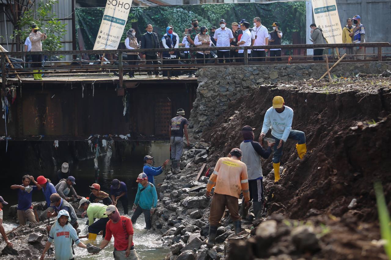 Tiap titik banjir yang ditinjau mendapat penanganan berbeda. Di Kolam Retensi Bima misalnya. Benteng yang jebol akibat arus air diperbaiki.